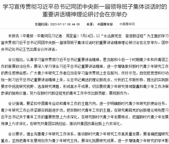 7月14日,以“永远跟党走 奋进新征程”为主题的学习宣传贯彻习近平总书记同团中央新一届领导班子集体谈话时的重要讲话精神理论研讨会在北京举办。团中央书记处书记王艺出席会议并讲话。