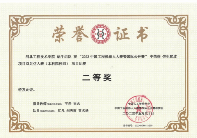 betway西汉姆联官网组织师生报名参加,经过现场激烈角逐,三个参赛项目均荣获国家级奖励,其中,在仿人竞速项目障碍赛中,由梁月肖老师和杨静宜老师指导的避障组(刘天雨、关佳雨、贾名扬)荣获一等奖(冠军),在仿人竞速项目标准赛中,由吴洪伟老师和崔建弘老师指导的竞走组(江凡、王天然、董子瑜)荣获一等奖(季军),在仿生爬坡项目双足仿人赛中,由王乐老师和崔志老师指导的蜗牛组(江凡、刘天雨、贾名扬)荣获二等奖。