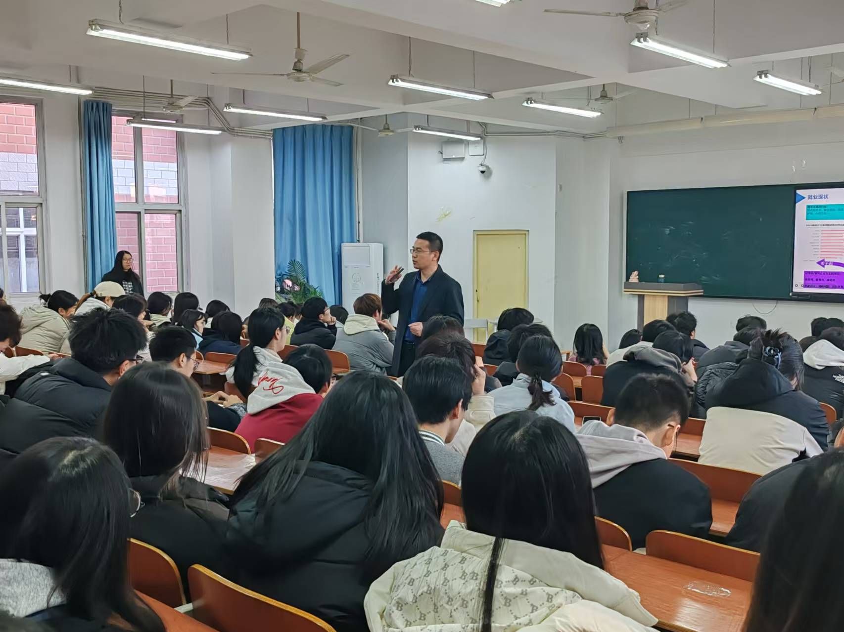 讲座伊始,赵广繁老师首先分析了当前的就业形势,他指出,随着社会经济的快速发展和产业结构的不断调整,就业市场也面临着新的机遇和挑战。学生们需要了解就业流向,关注企业裁员等热点问题,并根据自身专业和兴趣,设定合理的就业目标。