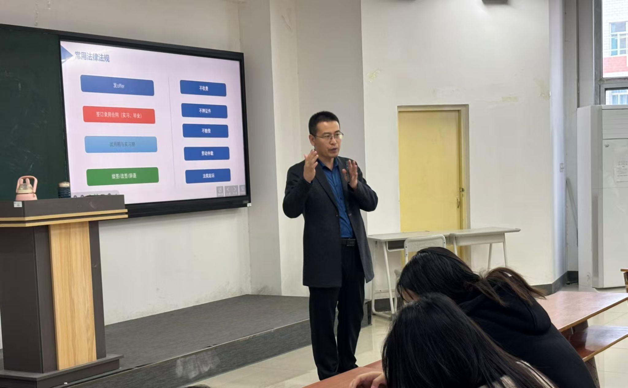 讲座的法律法规部分,赵老师重点讲解了求职过程中常见的法律问题,包括发offer、签订录用合同(实习、毕业)、试用期和实习期、续签/改签/辞退等。他提醒学生们要了解相关法律法规,维护自身的合法权益。