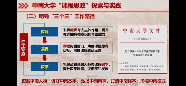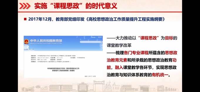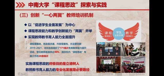 为落实立德树人的根本任务,全面推进课程思政建设,促进课程思政建设经验的分享交流,讲座以“融课程思政 促教学创新 提育人质量”为主题,以中南大学课程思政建设实践为基础,从“顶层设计、课程建设、教师培训、评价激励”等方面介绍课程思政经验和成果,包括中南大学如何开展以“促进学生发展为中心”,融合“课程思政”和“教学创新”两大能力并举的“一心两翼”师资队伍教育教学水平提升机制,以及各类课程的具体实践,实现以课程思政推进教学创新,以教学创新落实课程思政,推动各类课程思政建设的互学互鉴。