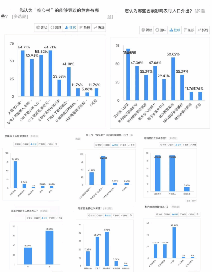 通过我们对村子的走访以及对村内人民的调查发现,村子里大多是上了年岁的老人和还在上学的孩子,调查结果显示各个村的交通处于一般状态,外出不是很方便。外出务工的中青年人占村子总人口的70%左右,造成空巢老人和留守儿童增多,村中的老人大多以依靠土地作为经济的主要来源的占比为17%左右,家中的主要来源还是外出务工,所占比例为41%左右。在调查结果中显示,所调查的人认为造成空心村的原因为“种地收入少,年轻人外出打工,老人逐渐逝去”该原因所占的比例高达94%。