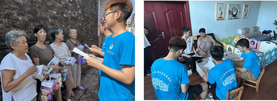 8月15日,小队来到古村落对村民进行走访和问卷调研,收集老年人对智慧养老的看法以及未来建设的期许,并将提前准备的小礼物送给接受采访的村民,认真倾听老年人的养老需求和困难,宣传智慧养老专业知识,完成调研问卷800余份。实践队在访谈中发现,大多数老年人对智慧养老的概念了解极少,但对于老年人健康体检以及上门服务等记忆深刻,村民对于如何养老感触良多,也迫切期待国家和社会可以提供更好的养老举措缓解老年人的养老焦虑。