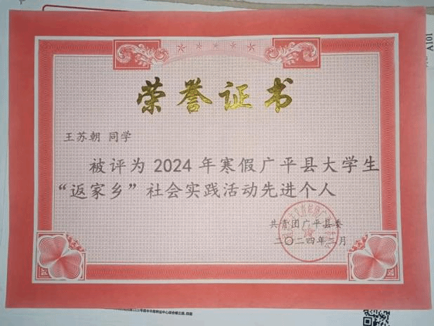 习近平总书记在庆祝中国共产党成立100周年大会上指出“未来属于青年,希望寄予青年”。青年之于党和国家而言,最值得爱护、最值得期待。在2024年-2025年寒假,王苏朝第三次投身于大学生返家乡社会实践中。“返家乡”社会实践是了解国情、认识县情、增长本领的最好课堂,是磨炼意志、汲取力量的火热熔炉,是理论联系实际、从校门走向社会的生动实践。