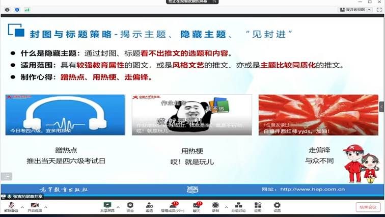 最后由张宸主编讲解封面与标题的重要性,高校推文受众是新青年人群,时尚的流行语热点以及别出心裁的封面图片更能吸引青年的目光。有好的封面,有趣的标题,可以更吸引点击量。张主编是中国大学生在线的微信官方主编,向我们分享了十万加点击量新闻稿的制作经验,生动有趣的讲解了新闻稿获取点击量的小妙招。