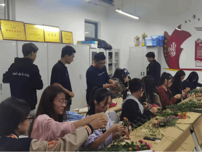 每个成员密切合作,互相帮助,充分展现了学院师生之间的团结和默契。整个筹备过程中,尹院长始终亲力亲为,帮助同学们解决问题,指导他们的工作。他不仅在挑选鲜花和绿植时给予同学们建议,还亲自动手裁剪和编织花环,带领同学们共同完成了一道道精美的花环。整个过程充满了欢声笑语和活力四溢的氛围。同学们一边互相交流,一边认真装饰,彼此之间不断地分享着自己的想法和灵感。这种合作和分享的精神使得每个小组的花环都独具特色。这些花环不仅色彩鲜艳、形状各异,更是展现了学院师生的创造力和艺术才华。