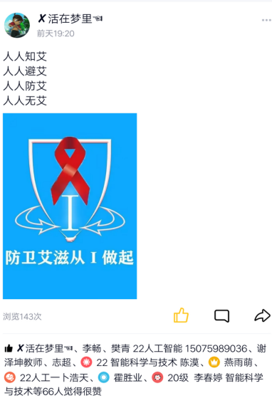 本次艾滋病预防宣传活动的成功举办,宣传了艾滋病的相关知识,促进了大学生对艾滋病的正确了解,使学生们懂得如何更好地保护自己和其他人,远离艾滋病,共建和谐、美好的校园环境。进一步推动了防治艾滋病的宣传和普及工作,增长了学生的防艾知识,提高了学生的自我防护意识,引导学生洁身自好,树立正确的性观念,减少艾滋病对个人、家庭和社会的影响。在教育青少年预防艾滋病的同时,也要教育青少年反对社会歧视,倡导相互关爱的道德风尚,为艾滋病毒感染者和艾滋病病人营造良好的社会环境。