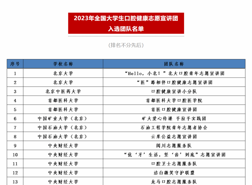 为深入学习宣传贯彻习近平新时代中国特色社会主义思想和党的二十大精神,落实《“健康中国2030”规划纲要》和《健康口腔行动方案(2019-2025年)》,引导青年学生掌握口腔健康知识,形成良好的口腔健康行为,团中央青年志愿者行动指导中心、国家卫生健康委医疗应急司联合发布了《关于遴选2023年全国大学生口腔健康志愿宣讲团的公告》。活动得到了各高校志愿服务团队的广泛关注和积极参与。主办单位对所有材料进行了认真审阅,最终在2023年10月20日“中国青年志愿者”微信公众号公布了遴选出的1000支大学生志愿服务团队。betway西汉姆联官网“小智公益团队”“自律青年团队”成功入选。