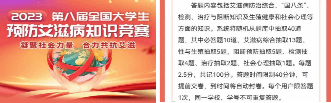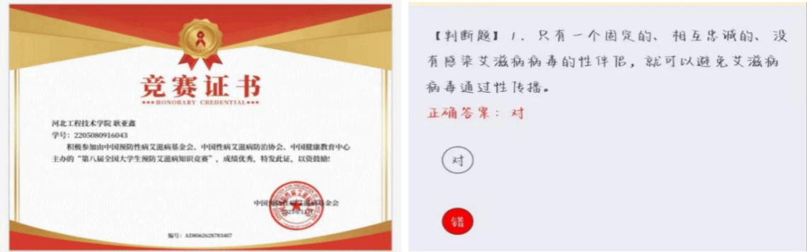 活动以“凝聚社会力量,合力共抗艾滋”为主题,主要包括艾滋病防治核心知识、艾滋病检测促进、母婴传播预防、安全性行为、毒品与艾滋、故意传播法律责任等宣传内容,突出艾滋病带来的危害,强调如何有效预防、及时检测,倡导社会关爱,有新意、有重点、有宣教意义。在提交题目后,学生们不仅能够获取竞赛证书,还可以看到自己的分数和错题,以此加深学生们对艾滋病的印象。