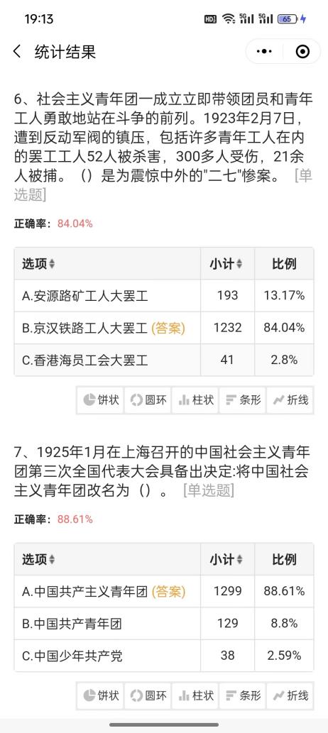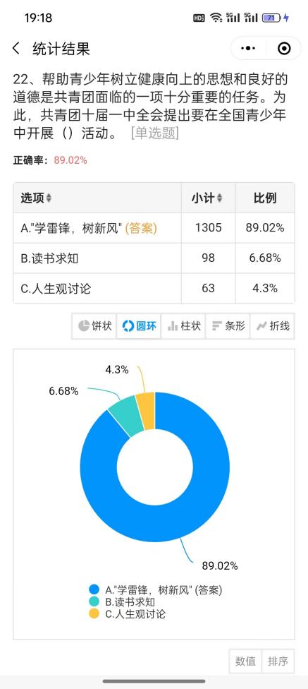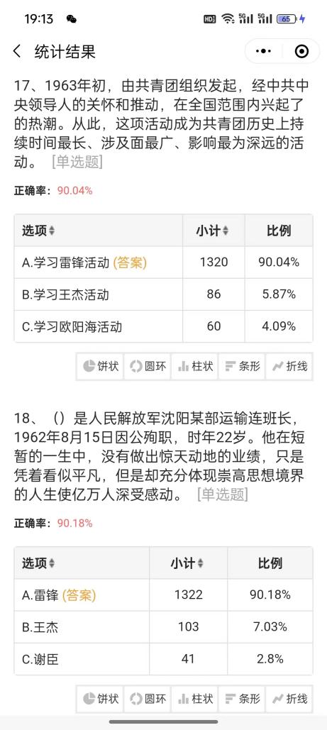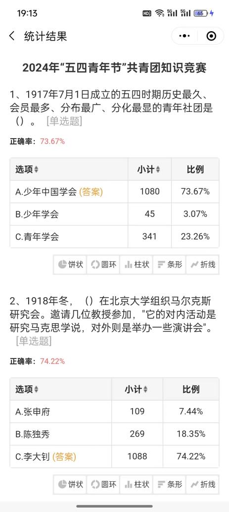 本次活动得到了广大学生的积极响应和热情参与,参与人数达到了1465人,体现了学生对共青团知识的浓厚兴趣。并且此次三个模块的题目的正确率都较高,共有339个一百分的,764个九十分以上的。每道题的正确率基本都在百分之七十以上,只有极少部分的题目正确率不达百分之七十,反映出学生对共青团相关知识的掌握程度普遍较高。通过此次竞赛,学生对共青团的理论知识有了更加深入的了解和掌握,提高了自身的理论素养和认识水平。