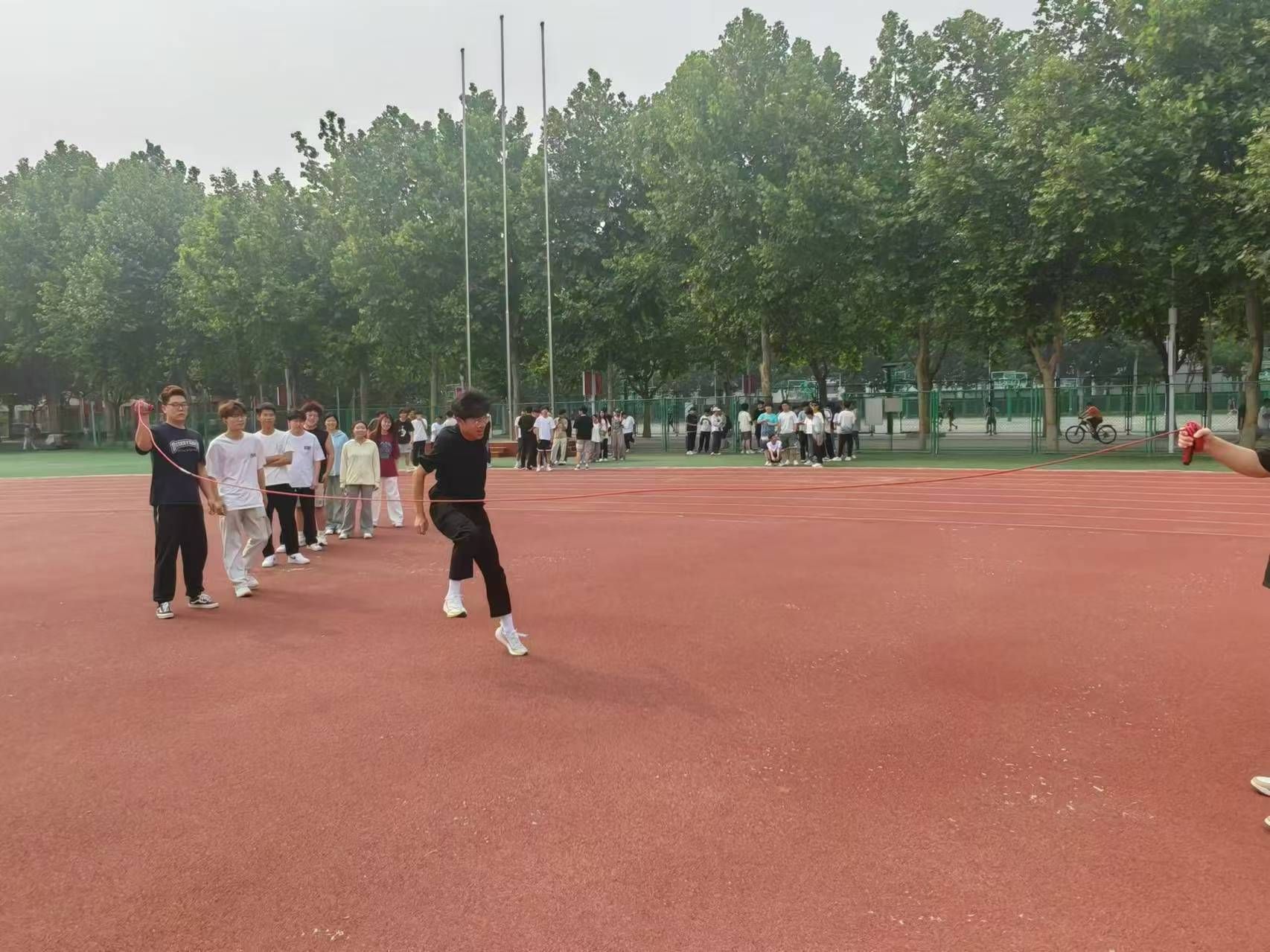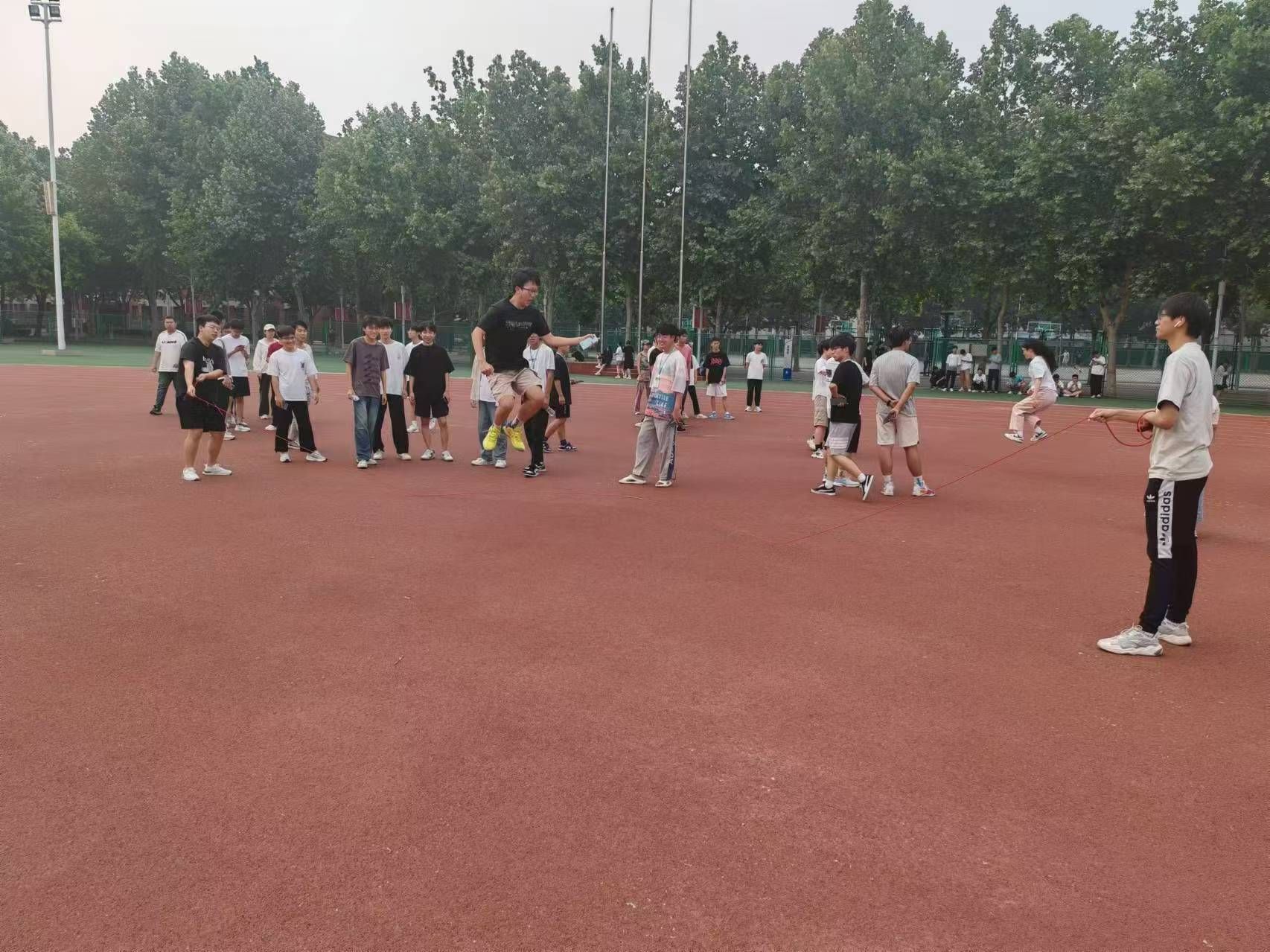 活动现场,学生被分为八人一组的团队,以八字大绳的形式进行比赛。随着裁判的一声令下,各组队员迅速进入状态,学生们紧密配合,协调步伐,每一次跳绳都凝聚着团队的智慧和力量。比赛现场气氛热烈,掌声、欢呼声此起彼伏,充分展现了学生们的竞技风采和团队合作精神。