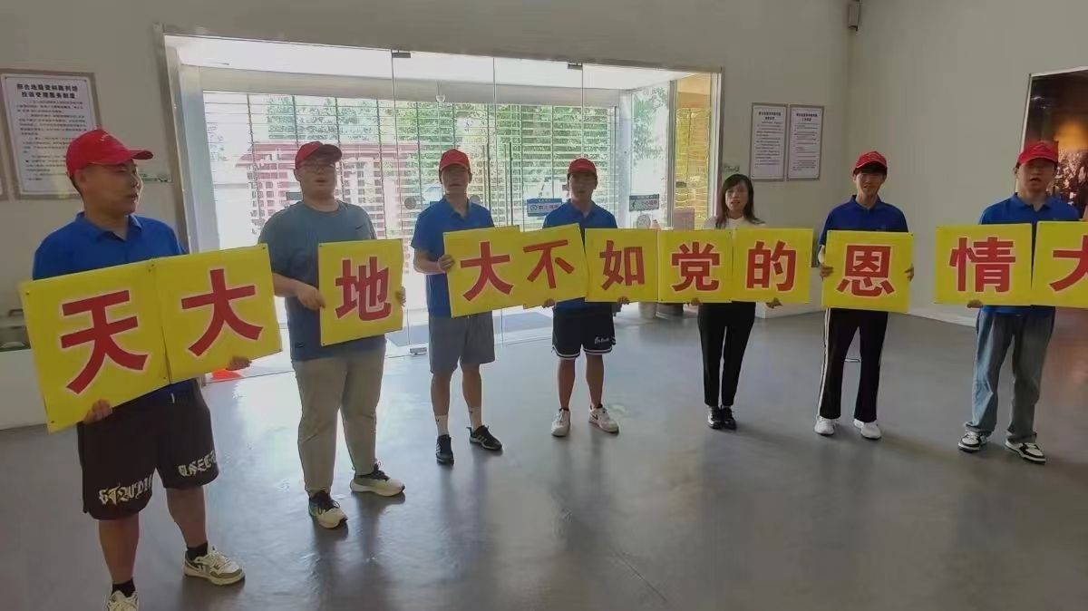 隆尧县应急管理局张伟伟跟队员们一起演唱《天大地大不如党的恩情大》
