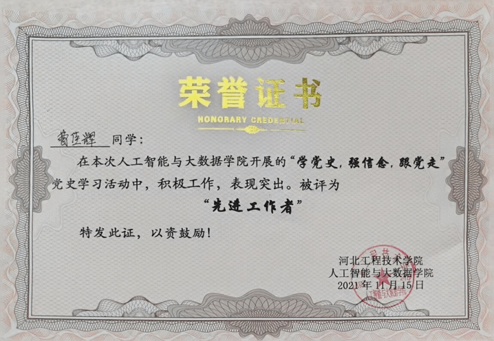 2021年院级“开展党史教育,重温峥嵘岁月”特授予“学习标兵“荣誉称号