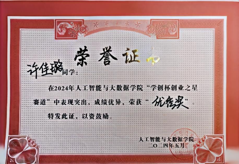2023年“学习伟人事迹,传承伟人思想”演讲活动中荣获“三等奖”,“三好学生”称号。