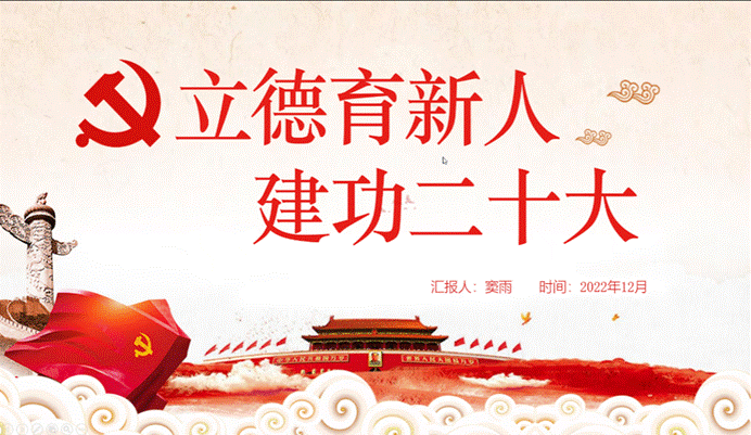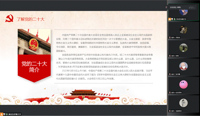 辅导员窦雨老师采用线上宣讲会的形式为学生进行二十大宣讲。首先,窦雨老师简明扼要的介绍了党的二十大的会议主题、会议议程及报告内容,强调了开展主题教育就要发扬理论学习优良传统,不断加强理论武装,推动习近平新时代中国特色社会主义思想往深里走、往心里走、往实里走,筑牢信仰之基、补足精神之钙、把稳思想之舵。接着窦雨老师以慷慨激昂的语言介绍了党从十九大以来的五年内所做出的重要工作及十年来对党和人民事业具有重大意义的三件大事及其重要意义,使学生更加坚定自己的理想信念,学习党的精神,始终以“不忘初心,牢记使命”争做有理想、敢担当、能吃苦、肯奋斗的新时代好青年。随后,窦雨老师解读了新时代新征程中国共产党的使命任务和合格党员的标准“四讲四有”及党员的素质拓展,使学生深刻领会党全心全意为人们服务的宗旨,加强了党的理论武装,引导青年学生要坚守底线思维,做到遵规守纪。最后,窦雨老师对宣讲内容进行了总结,提高了学生对于“立德育新人,建功二十大”宣讲活动的感知和对二十大内涵的领悟。窦雨老师的语言生动形象,简明扼要,增加了学生们的参与热情,给学生留下了深刻的印象。