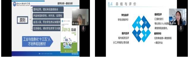 此次大赛以线上腾讯会议的形式开展,参赛教师分别是:数据科学与大数据技术系熊丽丽老师、数据管理与应用系江春然老师、人工智能系梁月肖老师、虚拟现实技术系房子婧老师、智能科学与技术系孙维雅老师、通识教研室邸宝莉老师。参赛人员自选课程内容进行说课,使用PPT辅助,每位老师说课时间不超过15分钟,评委现场进行点评。